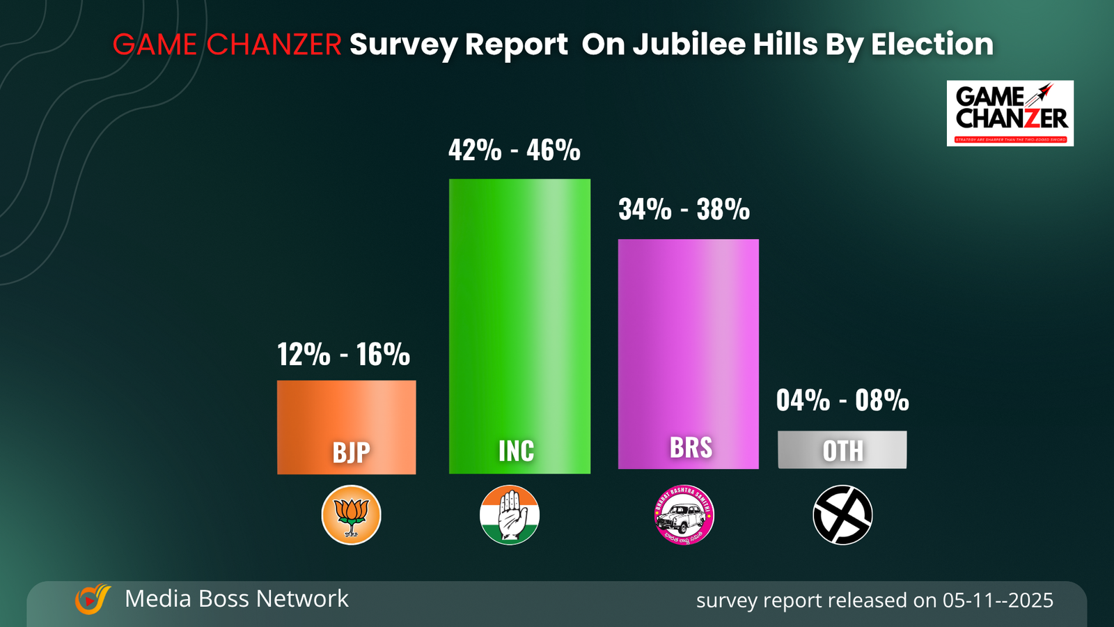 Representatives from Game Changer – MediaBoss Network said, “We conducted this survey by deeply analyzing voter opinions across various sections. Senior journalists and political analysts participated in this process. Data was collected from all regions and professional groups within the Jubilee Hills constituency. The results clearly indicate the direction in which the election is heading.”